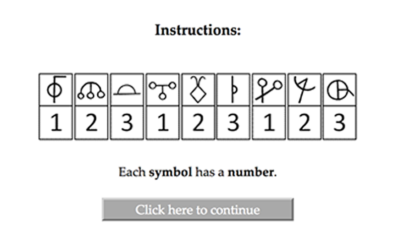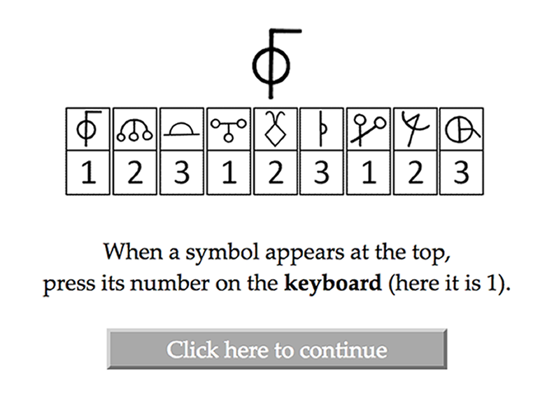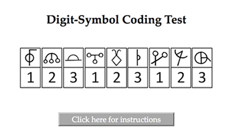 Digit-Symbol Coding Test (DSCT) is a computerized self-administered variant of the Symbol Digit Modalities Test. DSCT assesses visual processing speed, working memory, and attention. Total score, number of errors, and reaction time are recorded. The run time of the task is 90 seconds and takes approximately 5 minutes to complete the entire test. |